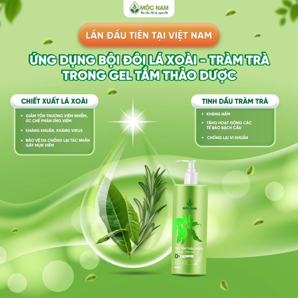 Thành Phần Tự Nhiên, Lành Tính - Gel tắm thảo dược Lá Xoài Tràm Trà được chiết xuất từ các thành phần tự nhiên, an toàn và dịu nhẹ cho da: