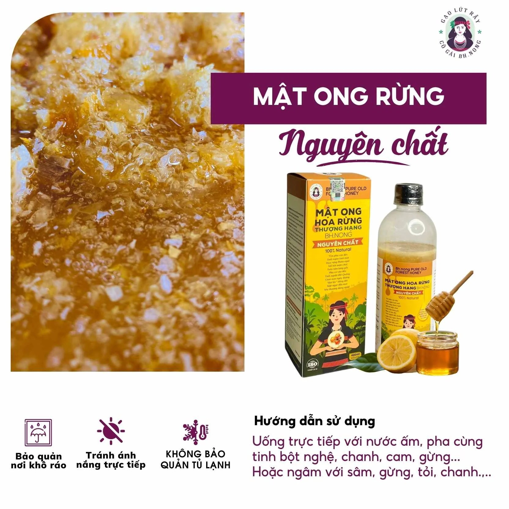Mật Ong Rừng BH.NONG được khai thác 100% từ các khu rừng già tự nhiên ở Quảng Nam bởi cộng đồng người dân tộc thiểu số. Cam kết nguyên chất, không pha mật nuôi, không pha đường, không chứa hương liệu, hóa chất chống côn trùng hay chất bảo quản. Do hoàn toàn tự nhiên, màu sắc, độ đặc loãng và khí gas của mật ong có thể khác nhau tùy thuộc vào khu vực, thời điểm khai thác và điều kiện thời tiết.
