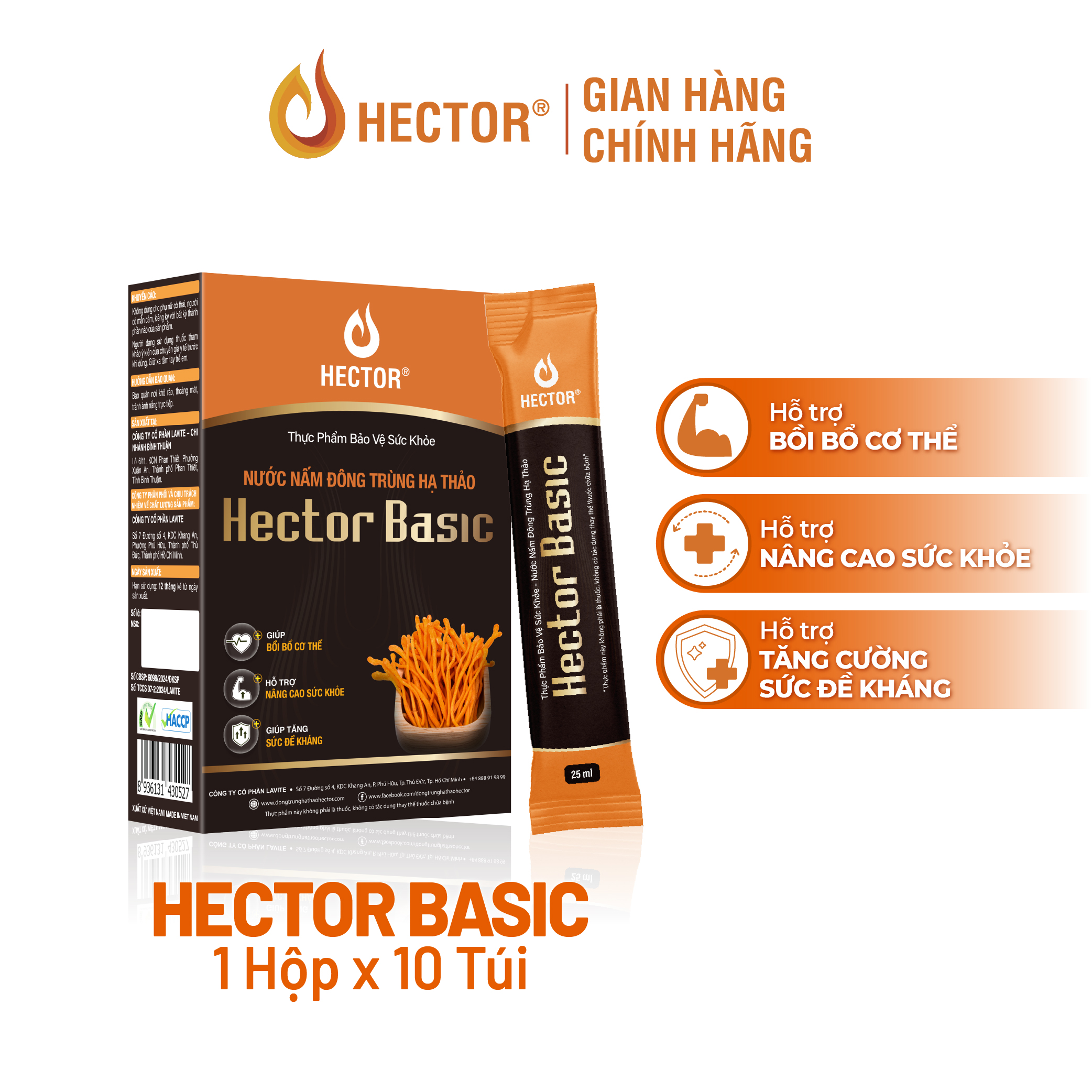 • Trong mỗi túi nước nấm Đông trùng hạ thảo Hector Basic 25ml chứa 5000mg dịch chiết từ nấm Đông trùng hạ thảo (tương đương 500mg nấm Đông trùng hạ thảo sấy thăng hoa (Cordyceps militaris)).