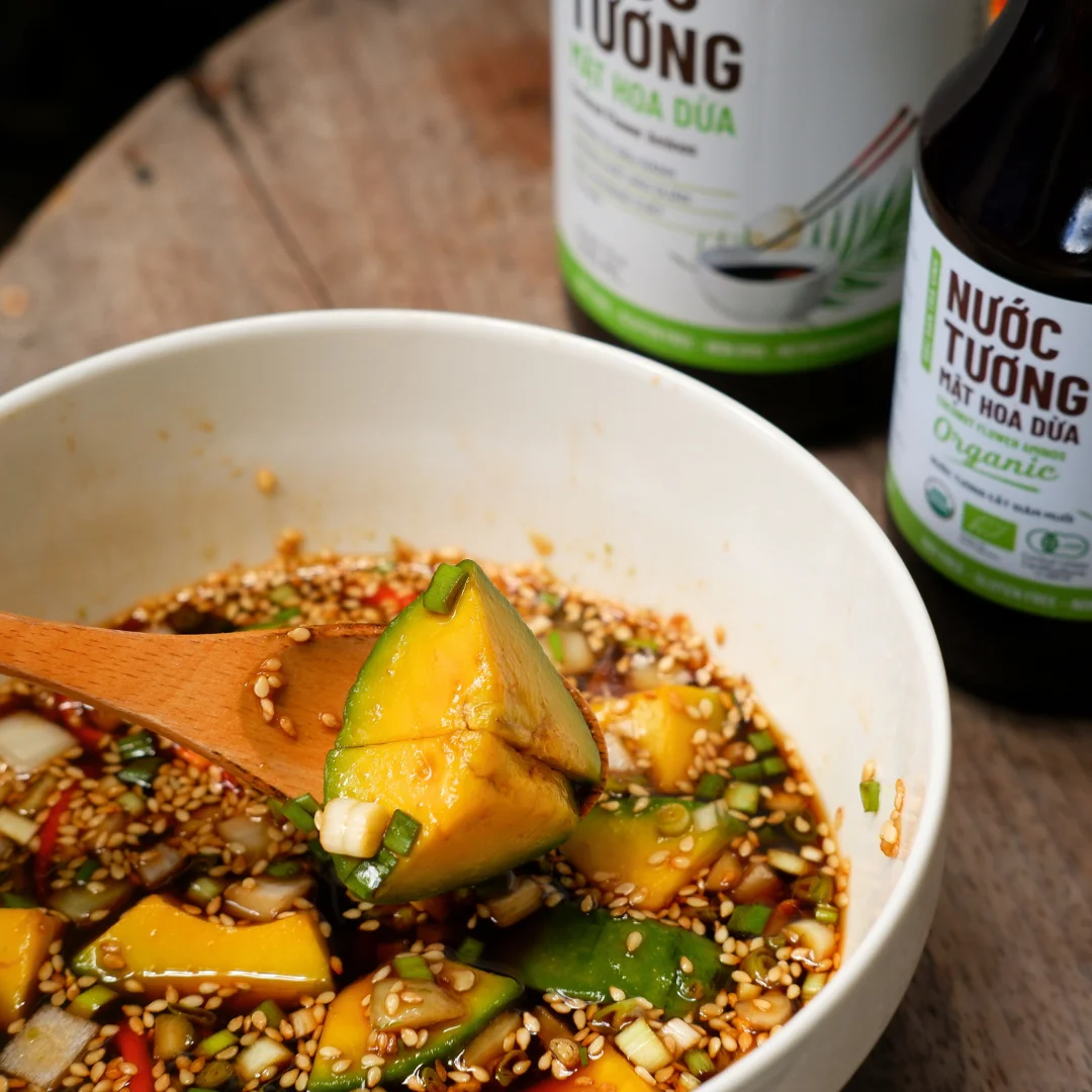 Với mật hoa dừa là thành phần chính, nước tương mật hoa dừa mang hương vị ngọt ngon và thơm dịu của dừa, vị umami tự nhiên giúp món ngon thêm tròn vị.