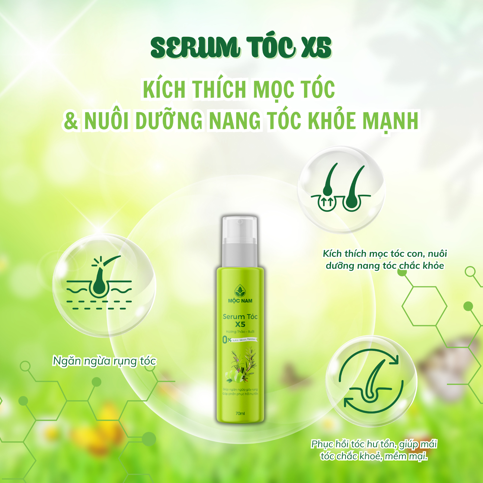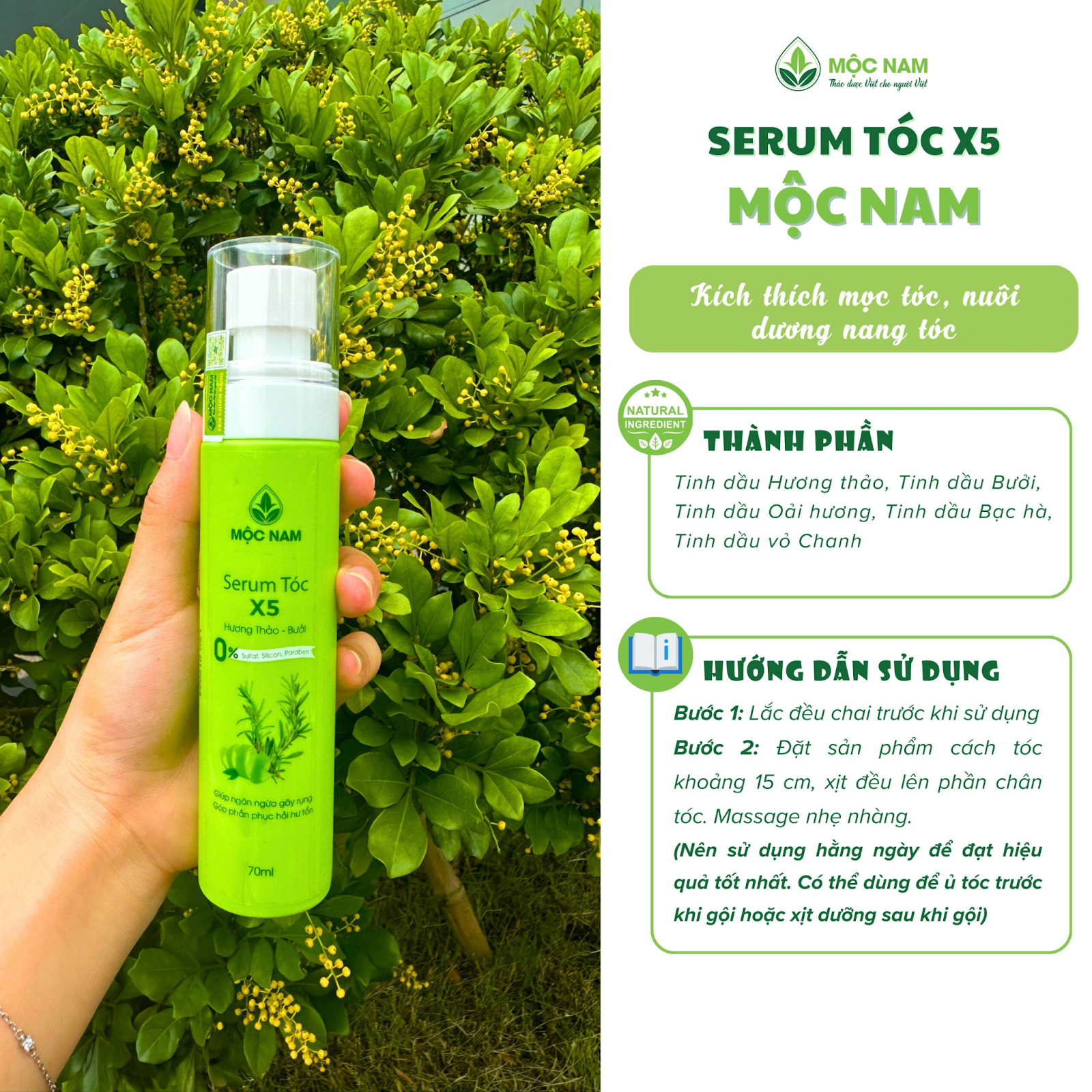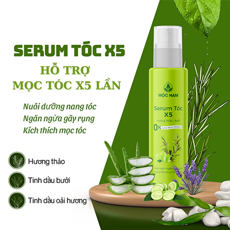 Nhờ công thức độc đáo với các thành phần thảo dược quý hiếm như Tinh dầu Hương thảo, Tinh dầu Bưởi, Tinh dầu Oải hương, Tinh dầu Bạc hà, Tinh dầu vỏ Chanh,... Serum tóc X5 giúp kích thích nang tóc phát triển, thúc đẩy quá trình mọc tóc nhanh và dày hơn gấp 5 lần so với thông thường.