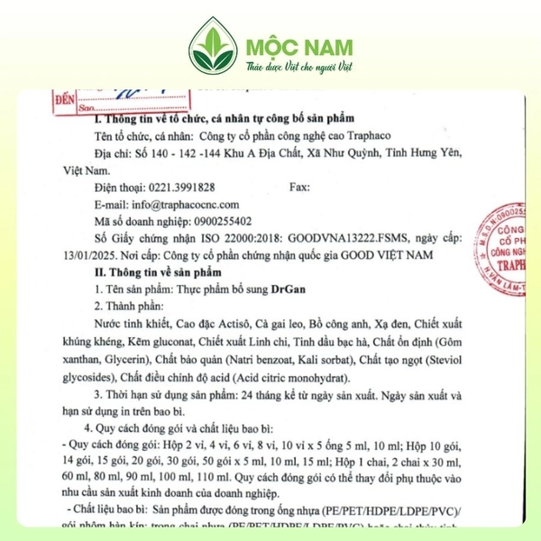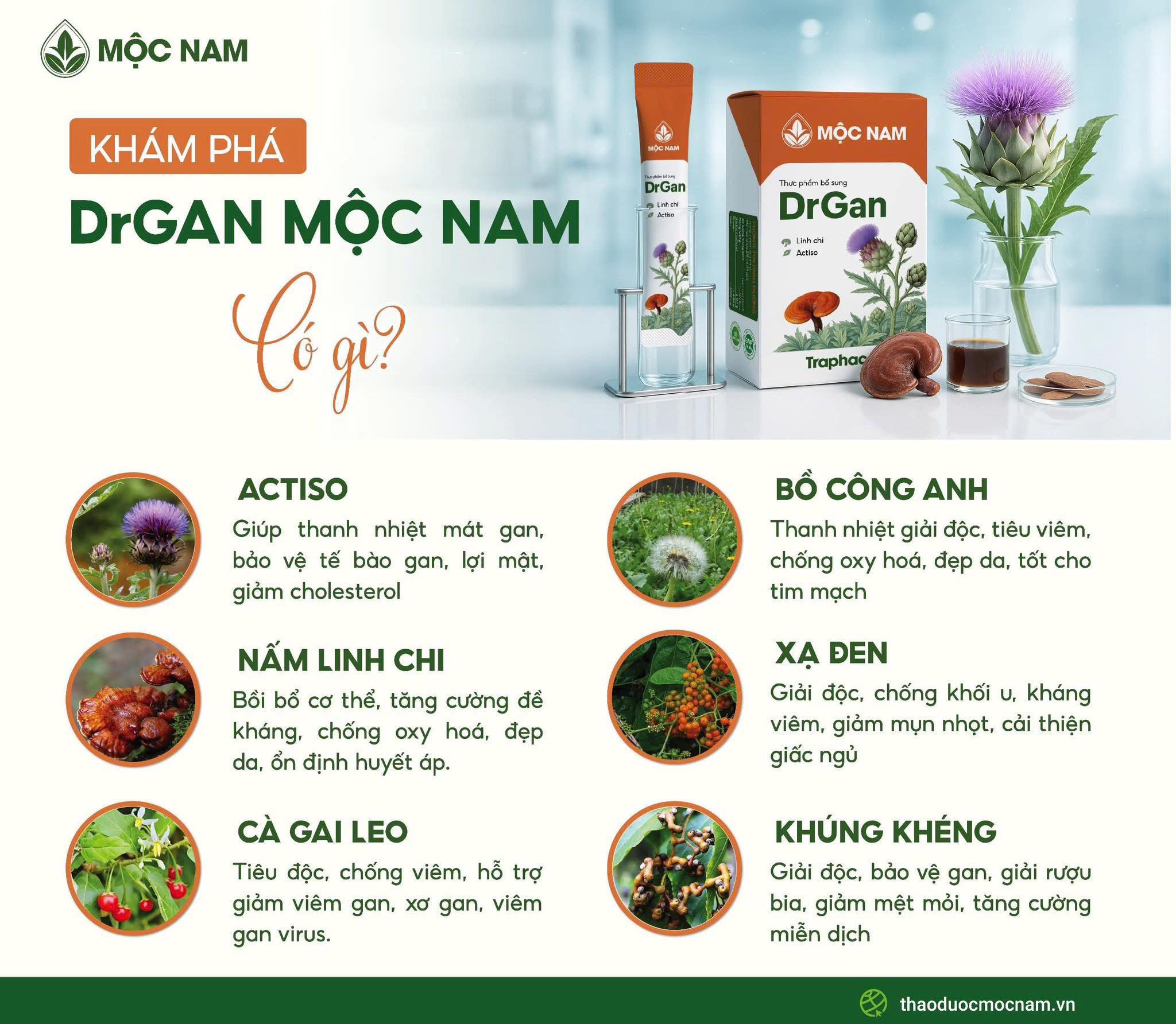 Trước thực trạng mà người Việt đang phải đối mặt mỗi ngày, Mộc Nam kết hợp cùng TraphacoCNC nghiên cứu và cho ra mắt thực phẩm bổ sung DrGan với mong muốn khách hàng được chủ động chăm sóc sức khỏe của mình với các thảo dược chất lượng.