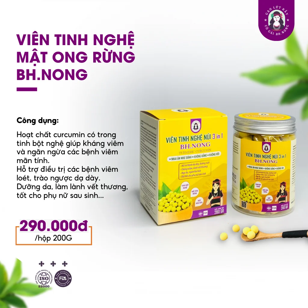 Viên Tinh Nghệ Sữa Ong Chúa BH.NONG được làm thủ công từ tinh bột nghệ núi, sữa ong chúa tươi và mật ong hoa cà phê nguyên chất. Sản phẩm hoàn toàn tự nhiên đạt chuẩn an toàn HACCP và ISO 22000:2018, mang đến giải pháp chăm sóc sức khỏe lành mạnh cho mọi đối tượng.