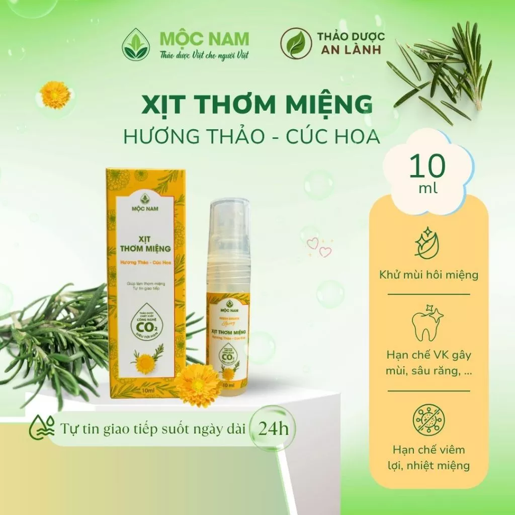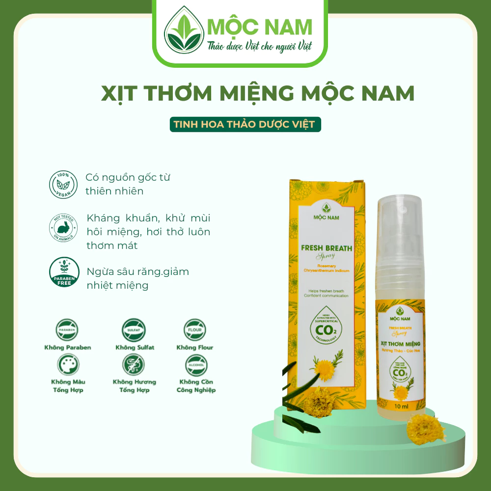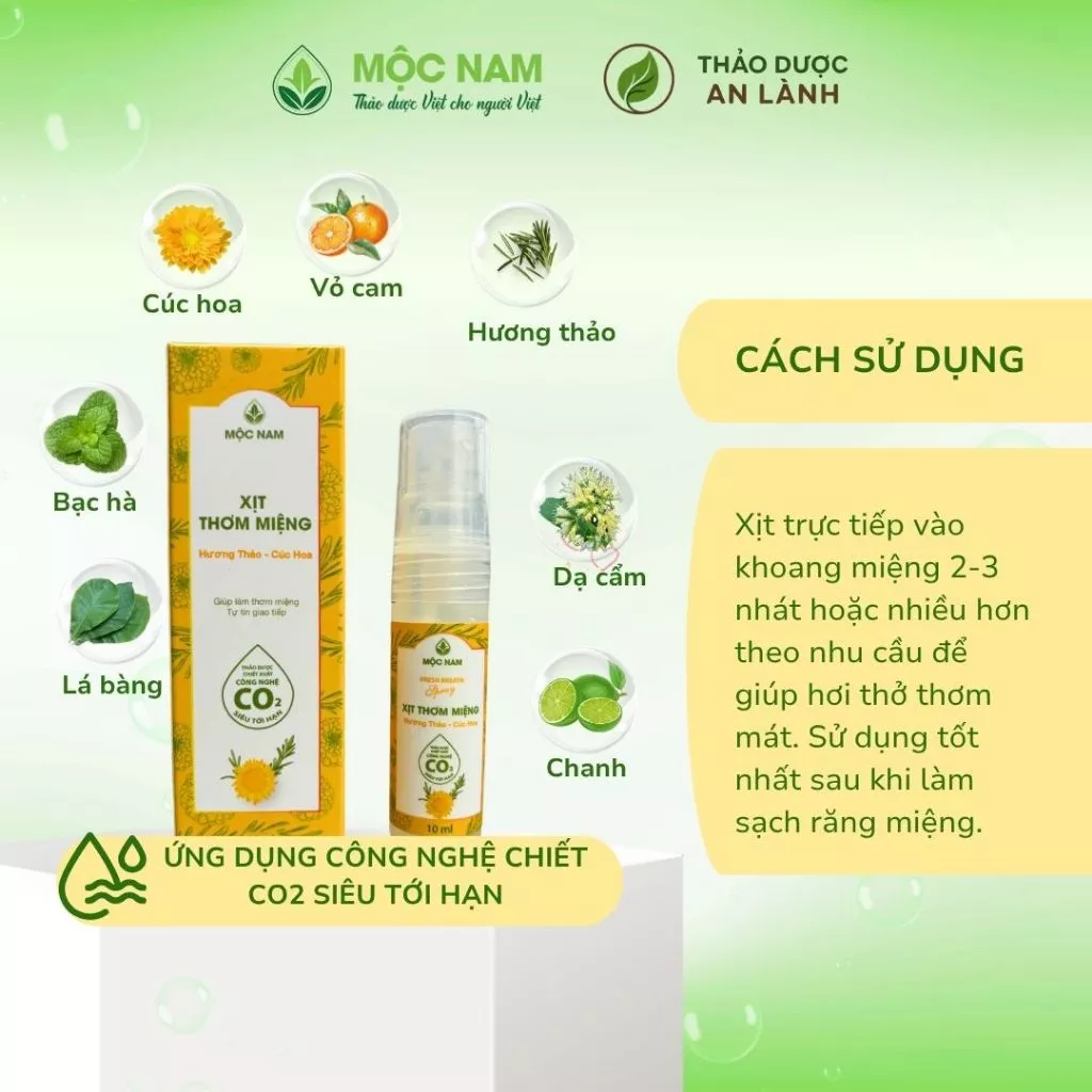 Với thành phần chính bao gồm hương thảo chiết CO2 siêu tới hạn cùng Cúc hoa và các loại thảo dược khác, xịt thơm miệng Mộc Nam giúp khử mùi ngay lập tức, dịu nhẹ, hạn chế vi khuẩn phát triển để bạn tự tin giao tiếp suốt cả ngày.